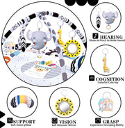 7 in 1 Baby Activity Mat:Our forest theme play mat is quadrilateral and the main colors are black and white. Includes 3 fabric toys with sound effects (giraffe, tree, elephant), a self-exploration mirror, a safety teether, a tummy cushion and 18 ocean balls to encourage baby to explore, learn and grow.