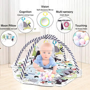 IDEAL GIFT FOR BABYS: Montessori Baby Gym play mat promotes visual, tactile, auditory and haptic development. It is suitable for boys and girls from 0 months. It can be used as baby shower gift, 1st birthday gift, Christmas/Thanksgiving gift for 3 4 5 6 7 8 9 10 11 12 18 months baby and 1 year old baby.