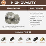 Whether you are remodeling your home, or building a new home, this sleek colonial privacy door knob provides the perfect balance between peace of mind security and extraordinary value. The satin stainless is inviting, resists smudging , and offers strong durability. These locksets feature round corner adjustable latches, nickel plated bolts, sized to fit most doors, and meet the uncompromising grading standards of the ANSI for residential and builders hardware. Maximum door thickness- 2 inches.