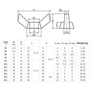 These wing nuts are threaded nuts with wings on opposite sides of the body intended for manual turning.