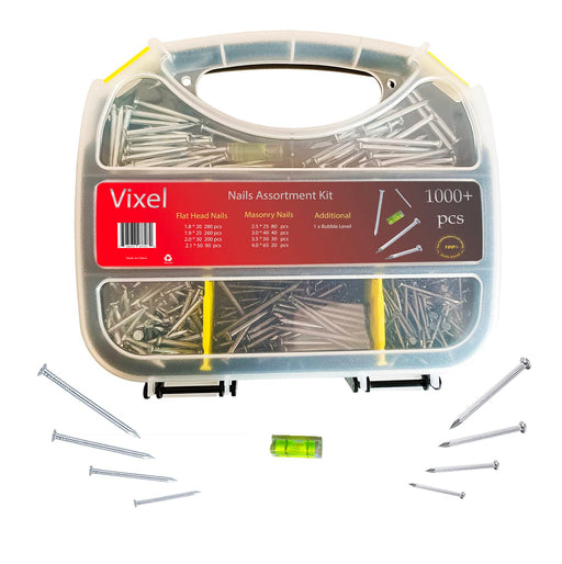 VIXEL 1000+ pcs of Flat Head and Masonry Concrete Nails Assortment Kit with Level Gauge included