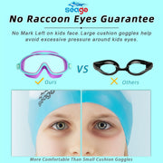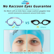 【COMFORT & SAFETY】Our swimming goggles use soft silicone cushioned frames for the best possible fit, 100% latex-free, which relieves the pressure on the skin and creates a waterproof seal to prevent children from chlorine and raccoon eyes.