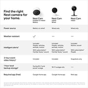The indoor Nest Cam security camera knows the difference between a person and a pet, and alerts you about the things that matter to you. The camera’s 24/7 live view shows you what’s happening from anywhere in the Google Home app.[1] And with up to 3 hours of free event video history, you can go back and see what you missed.[2] This home security camera lets you view live HD video, replay video recordings, talk to visitors, and more – all from the Google Home app. Nest Cam requires a free Google Account and is not compatible with the Nest app. [1]Some features, including mobile notifications, remote control, video streaming, and video recording, require working internet and Wi-Fi. [2]Up to 3 hours recording. Learn more at g.co/nest/3hours. [3]Nest Aware subscription sold separately. Continuous video recording requires that you wire Nest Cam. [4]Learn more at g.co/nest/cam-mem.