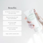 Green Relief Amino Gel Cleanser is specially designed to reduce frictional irritation and easily produce foam, setting it apart from cream-type cleansers by avoiding excessive surfactants and clumping. It is a favorite among those with oily or combination skin, acne-prone individuals, and those in need of a quick lather due to its refreshing and effective oil-removing properties. The cleanser utilizes smaller bubbles for deep pore cleansing, boasting a mildly acidic pH of 5.0-6.0 that helps maintain the skin's natural barrier and offers gentle exfoliation without causing irritation. Enriched with Hyaluronic acid, Betula platyphylla japonica juice, and betaine, it ensures a long-lasting moisturizing sensation. Additionally, it features coconut-based and amino acid surfactants for thorough yet gentle cleaning, making it suitable for sensitive skin, and is proudly vegan and clinically proven for effectiveness on sensitive skin.