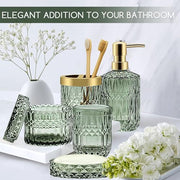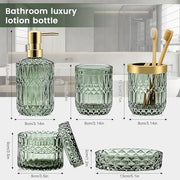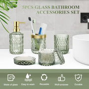 Topsky Green Bathroom Accessory Set, Glass Bathroom Decor Countertop Organizer,5Pcs Bathroom Accessories with Lotion Dispenser(Cylindrical), Soap Dish, Toothbrush Holder, Tumbler, Cotton Swab Jars