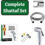 COMPLETE SHATTAF SET: Includes stainless steel hose, wall hook, bidet shattaf, 2 flow regulators, 2 stainless steel screws and 2 wall brackets