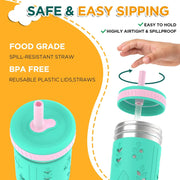 2. Splash-Proof Design: This kids tumbler features a removable straw and silicone nozzle engineered with splash-proof technology to minimize spills. The straw lid lets your child enjoy juice, milk, or milkshakes without messy accidents. A silicone ring ensures a snug fit for stability, while the non-slip design keeps the lid securely in place.