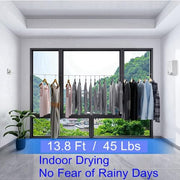 - ??? Capacity: Our heavy-duty clothesline extends up to 4.2 meters (13.8 feet) and supports a load of up to 20 kg (44 pounds). The length is adjustable to your needs, allowing you to hang clothes directly or use hangers for added convenience.