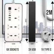 CIRCUIT GREEN Universal Extension Lead/Cord with Multiple Functions, UK 3-Pin Plug Socket with 6 Outlets | 3 USB Ports | 1 Type-C Cable Port, 2M Power Strip for Home, Kitchen, and Office (White)