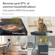 - 360° HEPA H13 filter: 9 metres of borosilicate microfibres, pleated over 200 times, capture 99.95% of pollutants as small as 0.1 microns.