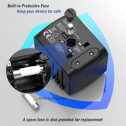 - Portable and Safety: This international travel plug adapter is made of high quality flame retardant material, certified by FCC, CE and RoHS etc., safety design:integrated security shutters and separate plug lock system. Built-in10A Fuse.
