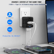 - 5 in 1 International Power Adapter: Provides a universal AC outlet and 1 USB-C +3 USB- A charging ports, AC output: 100-250V~10A Max. 50/60Hz; AC Power: 1100W at 110V; 2200W at 220V; 2300W at 230V; 2500W Max. at 250V, can charger up to 5 devices Simultaneously; This adapter is suitable for hotel, bedroom, and college dorm room, etc..