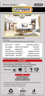 Unipower EX-1242 Power Socket with 3 way Outlets is portable compact power strip which is elegant in look and save space. Extra wide socket distance support you use every port simultaneous. Suits for US EU UK AU power adapter, provide more option. 3250W and 13A output support Rapid charger can auto-detect your devices and seek to maximize the fastest possible charge speed, can charge iPhone, iPad, tablet PC, Mp3, Mp4, digital camera and all device under 3250W. Anti-thunder Protection ensure more safety for household electric appliances. Anti-Fire material using higher quality standard ABS and bold power cord. High temperature resistant and flame retardant effective fire protection to eliminate hidden dangers Power Strip. This over load protector equipped power strip is designed to protect your children and family from lightning, leakage, and electronic shock. Unipower power adopts the latest technology, ensuring the safety of your family, and your electrical appliances. This power strip has a long extension cable of 3 Meter, which is enough to meet the requirement under all circumstances in the living room, bathroom, car washing, office, and more, never distressed at the shortage of the cord length. The flat plug power strip can be easily installed in anywhere, such as behind the sofa, or workbench. Built in with 13A fuse and safety shutter, Power Strips are atmost safe and protects your family from any mishandling, standard 3 Pin US Plug, satisfy as per US Standards.
