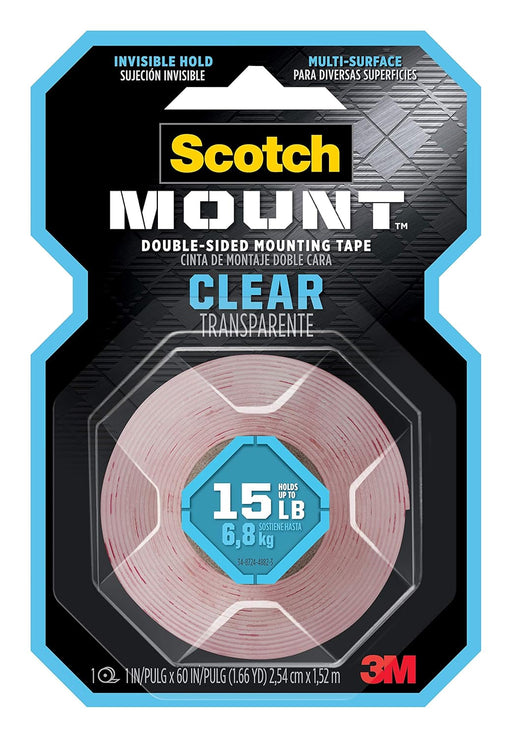 Scotch Mount Clear Tape 1 in x 60 in (2.54cm x 1.52m), 1 roll/pack | Holds 6.8 kg whole roll | Transparent color | Multi-Surface | Easy to use | No Tools | Double Sided Adhesive Tape