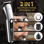 PRITECH Beard Trimmer for Men, 3 in 1 Hair Clippers for Men Kit, Nose Hair Trimmer, Micro Shaver Mens Grooming Kit Cordless Electric Hair Trimmer LED Display IPX6 (Silver)