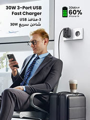 UGREEN 4-in-1 Travel Charger Adapter 30W Accepts Devices with UAE/KSA/UK Plugs for Use in Type C Sockets in European Plug Travel Converter Charger with 3 USB Ports, Type G 3 Pin to Euro C Plug