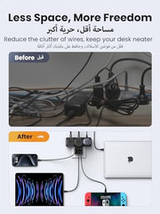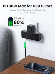 - ?6-in-1 Charger Plug, Perfect Power Extension?Features 3 Type G socket AC outlet (2990W) and 3 USB ports(PD 30W USB-C port & 2 USB-A ports), UGREEN triple multiple socket adapter can connect 6 devices simultaneously, ideal for daily needs, without worry about messy extension cord.