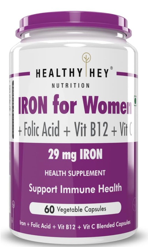 HealthyHey Iron Supplement for Women -100% Chelated - With Vitamin B12, Folic Acid & Vitamin C for High Absorption (60 Veg Capsules)