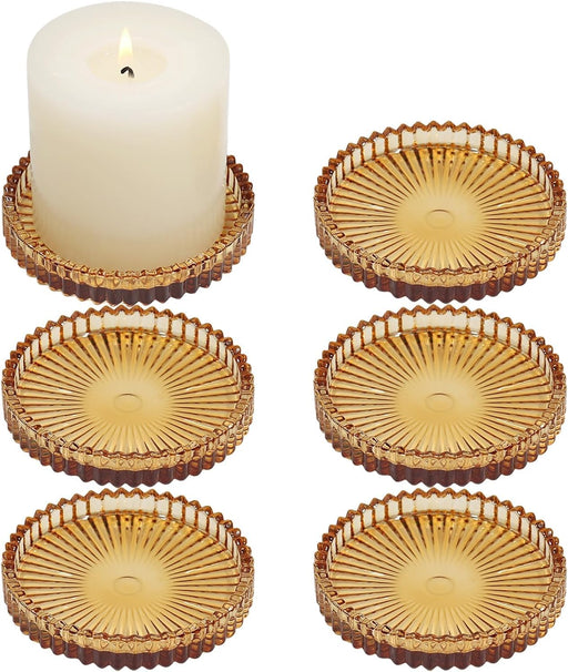 MCHERRY 6 Pack Glass Candle Holders, 4 Inch Glass Candle Holder for Pillar Candles, Christmas Candle Plate for Dining Table, Home Coffee Table Decoration (Brown)