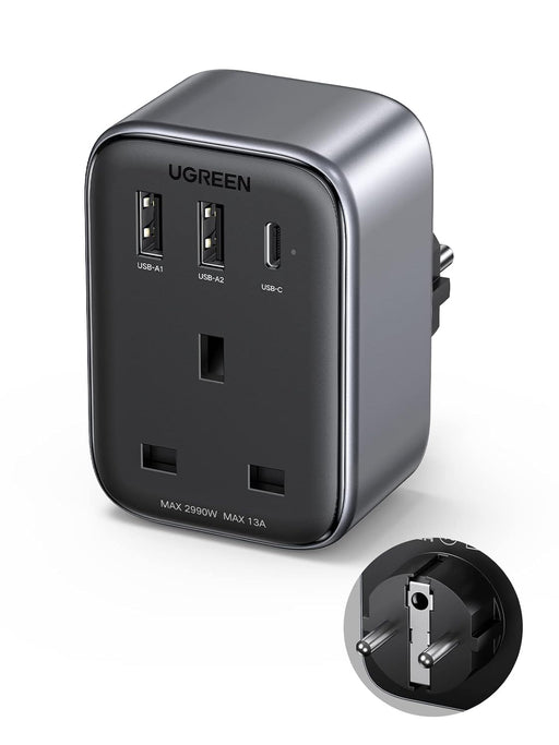 UGREEN 4-in-1 Travel Charger Adapter 30W Accepts Devices with UAE/KSA/UK Plugs for Use in Type C Sockets in European Plug Travel Converter Charger with 3 USB Ports, Type G 3 Pin to Euro C Plug