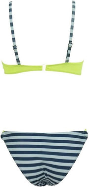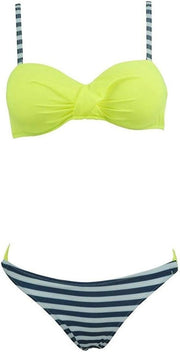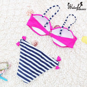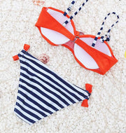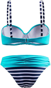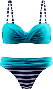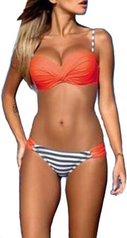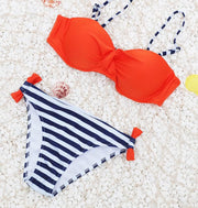 Style: Push up ruched bikini set, Strapless with padding, stripe bottom.