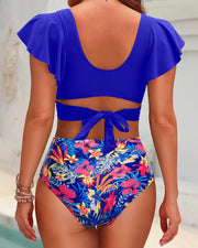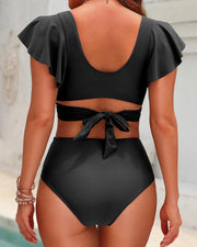 Two Piece Swimsuits: This 2 piece bikini set features a V-neck, criss-cross design, ruffle sleeves, a U-back, removable cups, and a high-waist design.