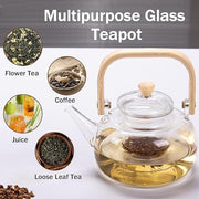 Elevate your tea-drinking experience with this stylish and functional glass tea kettle. Crafted from high-quality, durable glass, it boasts a sleek, transparent design that allows you to witness the mesmerising dance of your tea leaves as they steep. The large capacity ensures you can brew enough for family or guests, while the wooden handle provides a comfortable and secure grip, even when filled with piping hot water. This versatile kettle is not only suitable for preparing your favourite teas but also for heating water for coffee, hot chocolate, or any other hot or cold beverage you desire. Its timeless aesthetic and practical design make it a delightful addition to any kitchen or tea ceremony setup. With its easy-to-clean glass body and heat-resistant properties, this tea kettle promises years of reliable service. Embrace the art of tea-making and elevate your beverage experience with this elegant and functional glass tea kettle. Please note that it has a capacity of approximately 1.5 litres (51 fl oz).