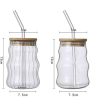 2 Pack Glass Drinking Glasses with Bamboo Lids and Glass Straw, Ribbed Glass Cups Vintage Drinking Glassware Ripple Crystal Cocktail Glasses for Iced Coffee Juice Beverage Milk 500ML