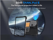 8849 TANK PAD E Specifications  Projector Tablet 10.95" HD Display|21000mAh Battery Versatile LED Light Emergency warning Light 100Lumens DLP Projector Helio G99 CPU Up to 24GB RAM(12흡 virtual) ,512GB ROM Android 14,NFCï¼IR Blaster,Underwater Camera, Gloves Mode Main Rear Camera :50MP Camara ,1/1.31" Ultra-large Sensor Details: GN1 CMOS sensor, 1.2μm, 7 piece lens, FOV 85°, Æ/1.95 large aperture Front Camera:32MP Dual Speaker 21000mAh Large Battery,66W Fast Charging 4G/3G/2G 4G: FDD-LTE: B1/2/3/4/5/7/8/12/13/17/18/19/20/25/ 26/28A/28B/66/71 TDD-LTE: B32/B34/38/39/40/41 3G: WCDMA: B1/2/4/5/6/8/19 2G: GSM: B2/3/5/8 CDMA: BC0/BC1/BC10