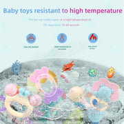 ???High temperature cleaning teether toys are healthier?Baby Teething Toys There is no coating on the surface of this teether toy. It is made of heat-resistant material and can be directly boiled in high temperature water.Warm reminder, so the rattle toy is a combination of ABS and safety soft rubber. The heat resistance time is different. It is recommended that the cooking time should not exceed 2 minute. Generally, it can be effectively clean in about 30 seconds.