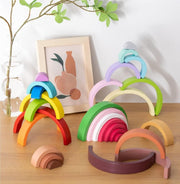 SAFE BUILDING BLOCKS - This wooden rainbow stacking game made out of a really pretty wood, no hase bad smell, very smooth and soft to the touch, won't hurt kids' skin. This rainbow nesting puzzle is an open ended and creative toy to make kids experience endless fun while stacking and playing.
