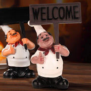 This is an adorable cute chef statue, white chef hat, red scarf, holding welcome sign board, and smiling at you all the time.