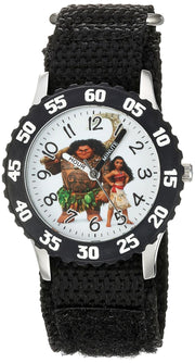 Disney Moana and Maui Boys' Stainless Steel Time Teacher Watch, Black Bezel, Black Hook and Loop Nylon Strap, WDS000032