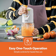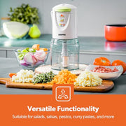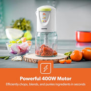 - POWERFUL, FAST & EFFICIENT – 400W Mini-Food Chopper lets you chop, blend, purée and mix a variety of ingredients for the perfect texture every time-thorough. You can chop, grind various ingredients, such as salsa, sauces, dips, dressings, onions, small herbs, baby food, meat, ham, garlic, onion, fruits, vegetables, nuts, seeds and more.