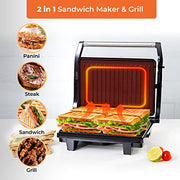 - LED INDICATOR, ADJUSTABLE TEMPERATURE & TIME - There are red and green indicator lights to show the working process, red light is the power indicator, green light is a heating indicator when the electric panini grill is plugged in, the 2 indicator lights turn on together after it reaches the set temperature, the green light turns off. Easy to adjust the temperature and the desired time with the rotating knob to grill your food in a perfect way as you need.