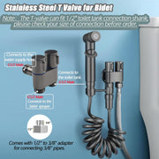 Wide Applications Handheld spray kits are also suitable for baby cloth diaper sprayers, pet showers, flower sprayers, toilet bowl spray cleaners, floor cleaning and more. You'll find all the uses for this bidet spray kit when you get it!.Package Contains 1 * Handheld Bidet Toilet Sprayer, 1 * Brass One-in-Two-Out Angle Valve, 1 * Brass One-piece Swivel Bracket and 78 inches Spring-loaded Flexible Hose.