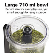 - Simplifying meal prep, one dish at a time. Use it for everything from chopping onions and nuts to mincing herbs, pureeing hummus and mixing dressings. It's perfectly sized for everyday use with a 710ml / 3 cup capacity bowl and is compact enough to fit in any kitchen. Whether you’re emulsifying Caesar dressing or pureeing baby food, it’s easy to add the necessary liquids to the oil dispenser on the lid during processing. For easy cleanup and peace of mind, the bowl, blades and lid are dishwasher safe and all food zones are BPA free