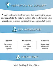 The refreshing note perceived at first contact comes from the refined blend of mandarin, bergamot and orange. This pleasing prelude flows immediately into the aromatic accord of lavender, juniper berry, basil and anise star. It evolves into a fine heart note in which the delicacy of lotus flowers and orange blossom blends seductively with the spiciness of ginger. It is the subtle woody and balsamic notes, accompanied by luxurious sandalwood, sumptuous benzoin and white musk, which are responsible for the lasting sensuousness of this fragrance.