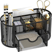KASTWAVE Mesh Desk Organizer, Desk Organizer Stationery Storage, Pencil Holder for Desk with 9 Compartments and Mini Drawer, Wire Mesh Office Supplies Desk Accessories & Workspace Organizers (Black)