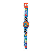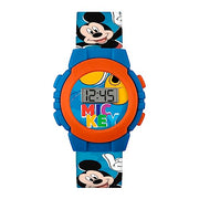 Disney Mickey Mouse Multicoloured Digital Watch. Featuring a character printed strap with traditional buckle fastening, round plastic case with fun colourful dial and digital time display. Packaged in an official branded gift box and comes with one year guarantee.