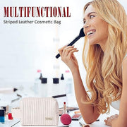 Small Makeup Bag, PU Striped Leather Cosmetic Bag, Portable Travel Makeup Pouch,Waterproof Cosmetic Pouch with Handle,Cute Makeup Bags for Women and Girls (Blue)