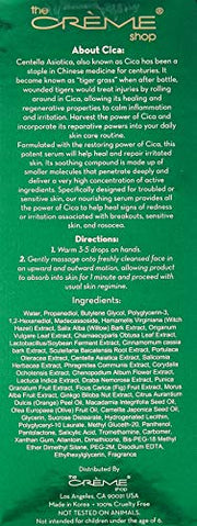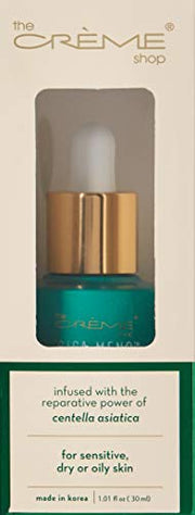 Centella Asiatica, also known as Cica has been a staple in Chinese medicine for centuries. It became known as "tiger grass" when after battle, wounded tigers would treat injuries by rolling around in Cica, allowing its healing and regenerative properties to calm inflammation and irritation. Harvest the power of Cica and incorporate its reparative powers into your daily skin care routine. Formulated with the restoring power of Cica, this potent serum will help heal and repair irritated skin. Its soothing compound is made up of smaller molecules that penetrate deeply and deliver a very high concentration of active ingredients. Specifically designed for troubled or sensitive skin, our nourishing serum provides all the power of Cica to help heal signs of redness or irritation associated with breakouts, sensitive skin, and rosacea. We focus on healthy pH levels and formulations that the skin recognizes and easily absorbs. We strive to take skincare to the next level, restoring a healthier, more moisturized, plumper and younger looking skin. THE BRAND: The Crème Shop has been in the business for decades with its humble beginning rooted in South Korea over 45 years ago. All our skin care and majority of our makeup and cosmetics line are proudly made in Korea although the company is currently head quartered in Los Angeles, California.