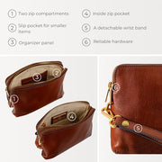 - A zip pocket for a smartphone and a slip pocket for smaller items;
