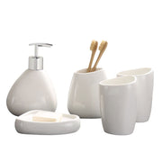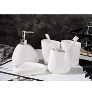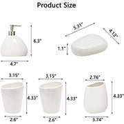 TOMVAES 5 pieces bathroom accessory set includes soap dispenser, toothbrush holder, 2 tumblers, soap dish. Made of dolomite ceramic material, smooth line shape, looks elegant, great math with any bathroom styles.