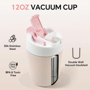 Travel Coffee Mug with Ceramic Coating, 12oz Double Wall Insulated Coffee Tumbler with Lid and Straw, Stainless Steel Leak Proof Tumbler Reusable Coffee Cup for Cold&Hot Drinks, Men Women, Pink