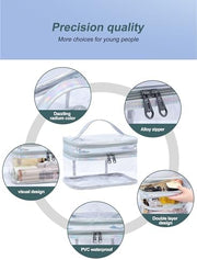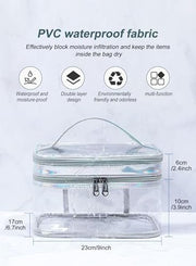 Easy to find: The makeup bags is divided into two layers. The top layer is transparent and you can clearly see the contents of the internal storage and ensure that the wet and dry are separated.The top of the lower layer of the travel cosmetic bag contains 6 independent brush slots, which can fix the brushes from shaking and falling damage.